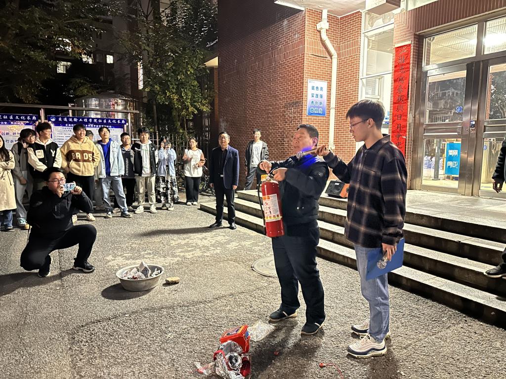 接着,保卫处消防科易国安为同学们现场讲解并演示了防毒面具、干粉灭火器的正确使用方法,并指导同学们佩戴防毒面具和使用灭火器,现场同学们踊跃参与体验,掌握了消防器材的使用方法。