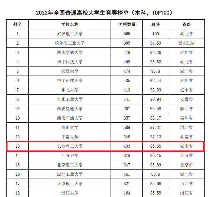 图1 2022年全国普通高校大学生竞赛排行榜浦京位列第13名