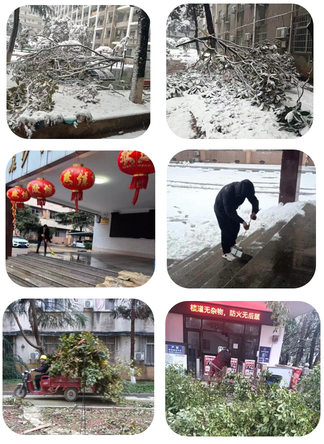 2024年2月8日,长沙迎来暴雪冻雨天气。为了保障校园安全,确保寒假各项工作平稳运行和春节的平安详和,继教学院学工与后勤保障部在学院党政班子的领导和部署下,提前做好各项应急准备,即时组织人员对学院附近校内主要交通要道、学生宿舍、教学区域各楼栋出入口开展了融雪撒盐、铺设防滑麻袋等除雪、去冰、清障工作。针对树木压断险情,及时组织人员对存有安全隐患的树木、树枝进行截断和清理。临近开学,随着师生陆续返校,学工与后勤保障部全力做好了保水供电工作和食堂开餐物资准备,落实24小时值班值守要求,加强学生寝室和各教学楼栋巡检巡查,对发现的问题及时整改解决。