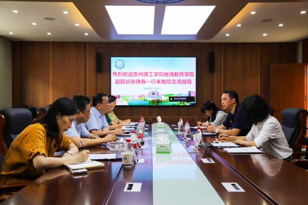 2024年7月2日下午,贵州理工学院继续教育学院副院长张挣鑫一行来我院调研交流。双方在15教四楼会议室进行了座谈交流。350vip浦京集团官网继续教育学院党委书记刘思强、副院长谢朝华和成教、自考、培训等相关部门人员参加座谈。