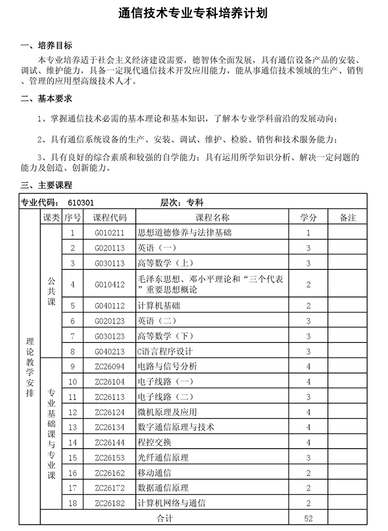 专科培养计划-专业代码:610201 计算机应用技术专业