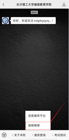 1.关注微信公众号“350vip浦京集团官网继续教育学院”,点击“服务查询-报修维修”,如下图所示。