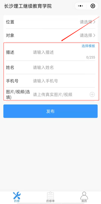 (3)点击描述,对维修内容进行描述,并正确填写姓名、手机号等信息,上传相关图片或视频,如下图所示。