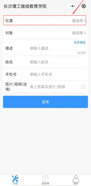 2. 进入报修维修后,填写好楼栋位置、寝室号、报修类别、维修内容、姓名及电话等内容,可选填图片或视频。一定要正确填写电话等联系信息,若有问题方便维修师傅联系哦。