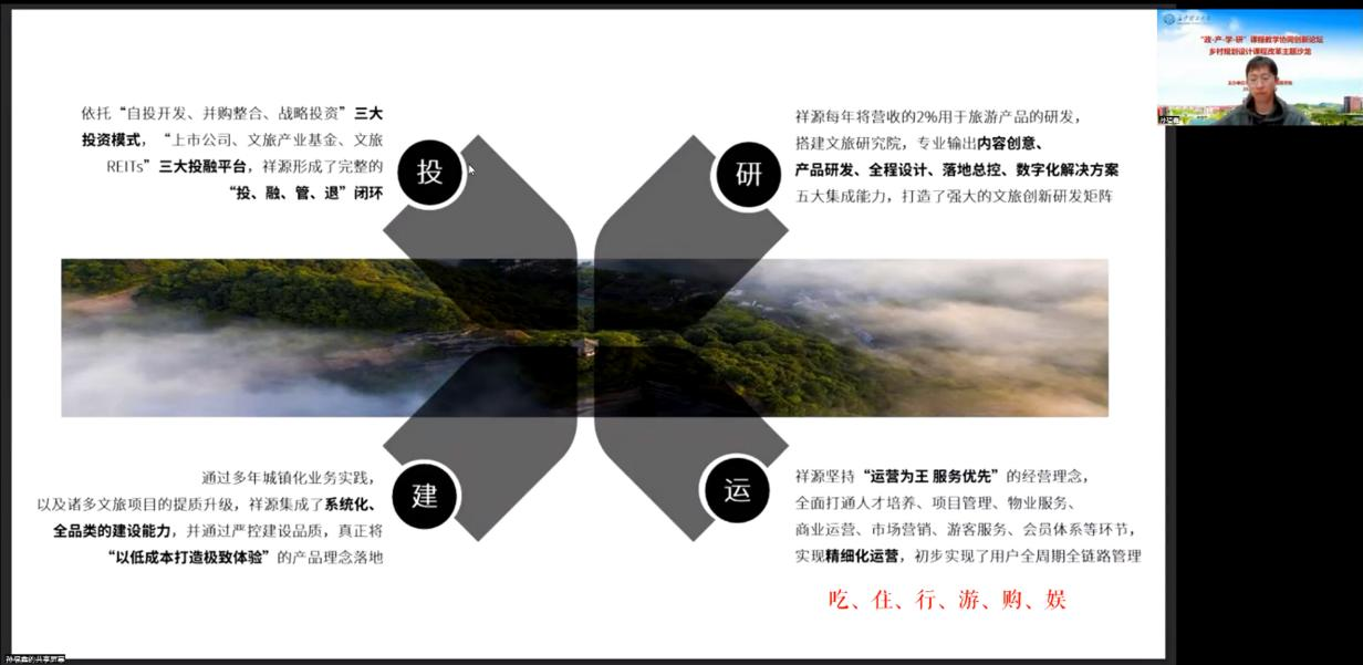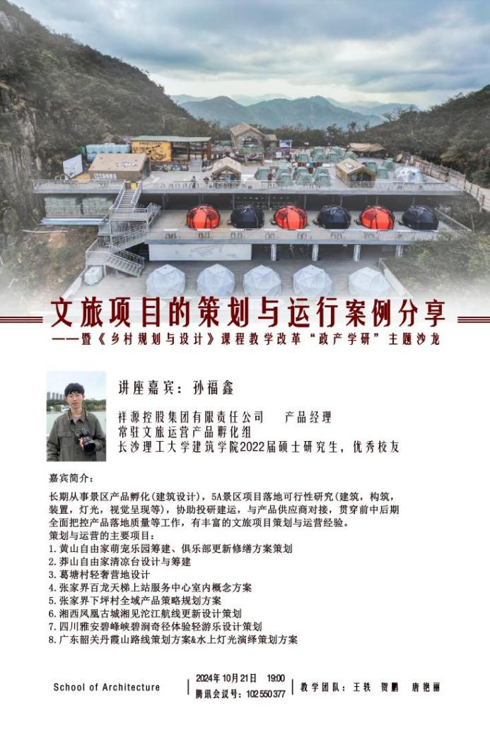 为积极响应国家“乡村振兴”人才培养的战略需求及其新时期村镇发展的趋势与市场需求,激发高校学子的乡村振兴、地方发展责任感,10月21日晚,由湖南省国土空间规划学会规划教育工作委员会指导、350vip浦京集团官网建筑学院主办的“政产学研”课程教学协同创新论坛——乡村规划设计课程改革主题沙龙在线上成功举行。本次活动邀请了祥源控股集团有限责任公司常驻文旅运营产品孵化组的产品经理,350vip浦京集团官网建筑学院优秀校友,孙福鑫先生做“文旅项目的策划与运行”的案例分享与有关设计类专业人才创新思维培养的教研讨论。350vip浦京集团官网教学督导、建筑学院欧阳国辉教授,城规系系主任贺鹏老师,乡村规划课程组王轶老师、唐艳丽老师和2021级城规专业全体本科生、建筑学院部分研究生参与了本次活动。
