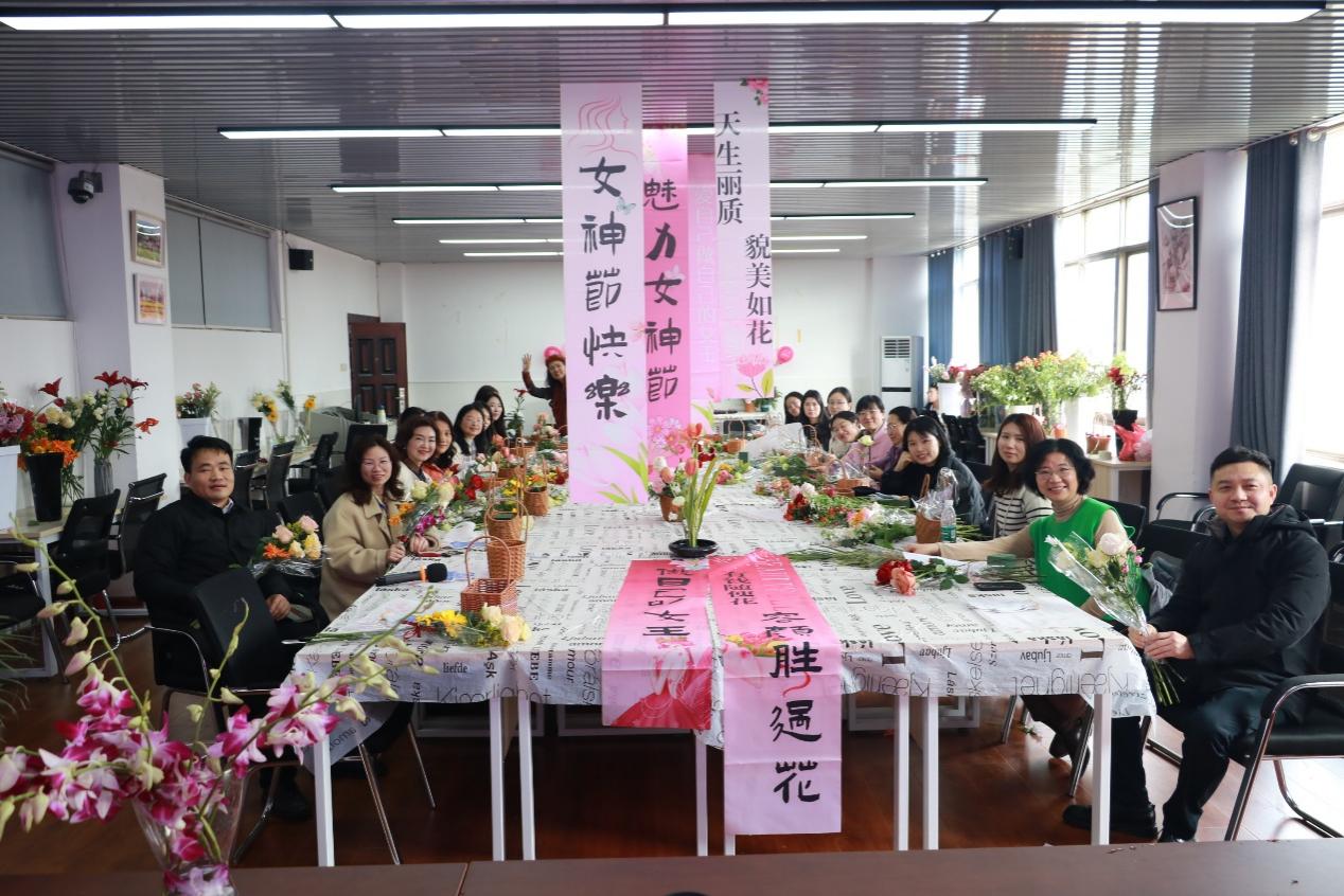 活动现场以粉色调为主,精心布置了每个角落,桌上摆满了玫瑰、向日葵、康乃馨等各类鲜花,色彩缤纷、香气扑鼻。活动伊始,学院党委副书记肖义慧主持,为活动暖心开场。随后,学院党委书记熊鹰致辞,向全院女教职工致以节日的问候,对她们在教学、科研、学院发展等各方面的辛勤付出表达了诚挚感谢。接着,校工会朗诵协会会长李慧老师带领学院老师朗诵《柔和的力量》,“女性自有力量,温柔可抵风霜......”她们的朗诵情感真挚饱满,如潺潺溪流,淌入老师们的心田,让大家沉浸在女性力量的诗意世界里。最后,专业花艺老师陈娟教授指导老师们插花。她细致讲解插花技巧,从花材的挑选、修剪,到色彩搭配、造型设计,一步步演示,让大家迅速掌握插花要领。女教职工们兴致勃勃,纷纷动手实践。她们相互交流、探讨创意,精心搭配每一朵花,力求让作品完美。在花香四溢,欢声笑语的氛围里,一件件独具匠心的插花作品诞生,有的简约优雅,有的华丽大气,各具特色。