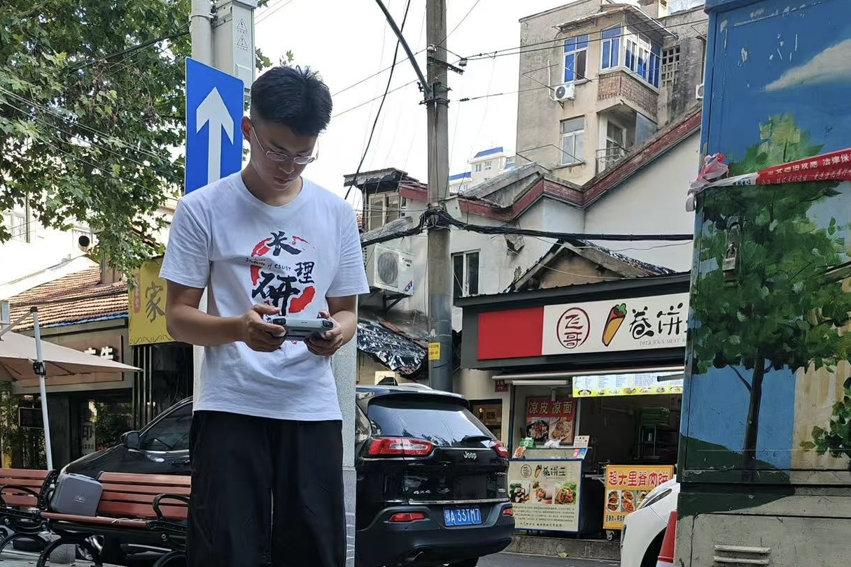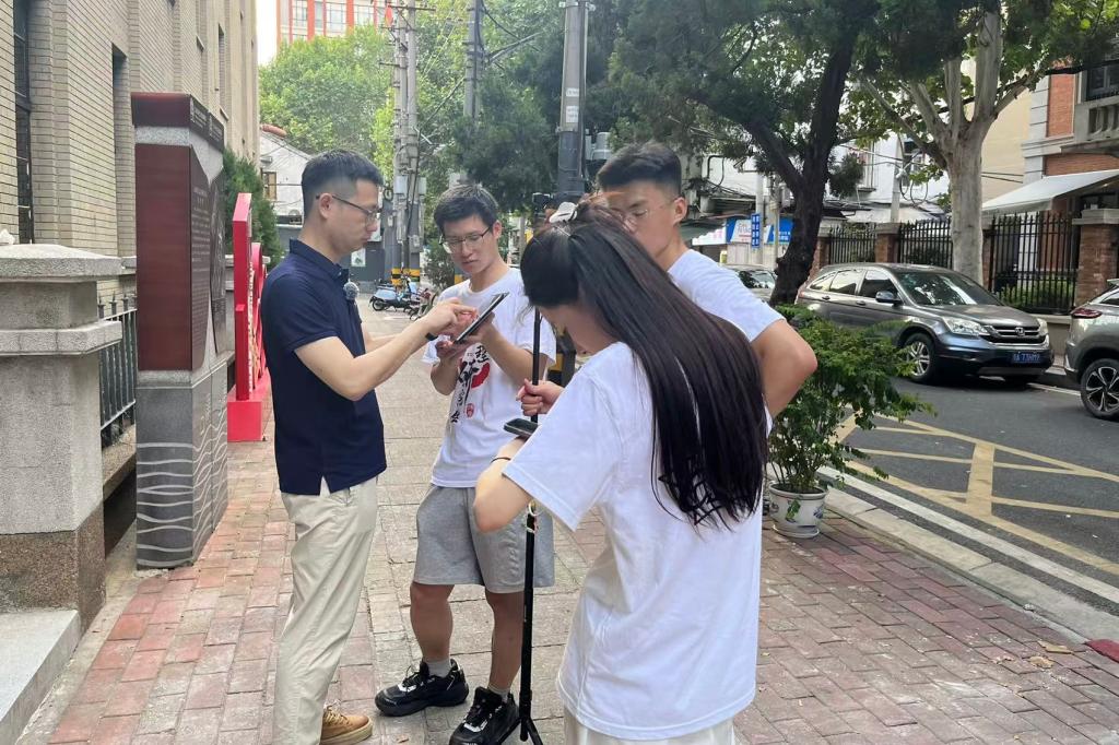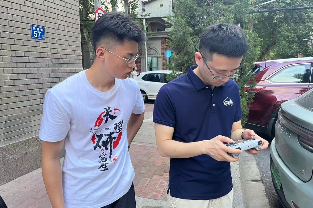实践团队抵达八路军武汉办事处旧址展开实地勘察。为全面掌握建筑外景及其与周边环境的空间布局关系,团队运用无人机航拍技术,对旧址外部环境进行了高精度、全方位的数据采集,为后续的建筑学分析奠定了详实的数据基础。