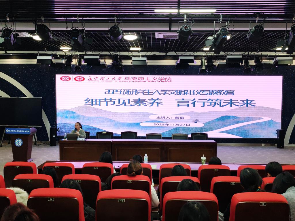 2025年12月27日下午4:30,350vip浦京集团官网马克思主义学院在云塘校区文科楼B300报告厅开展2025级研究生入学文明礼仪专题教育。本次活动由马克思主义学院学工办主任曾蓓担任主讲,2025级全体研究生参加。