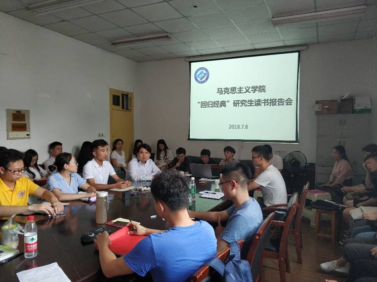 7月8日下午3点,350vip浦京集团官网马克思主义学院“回归经典”研究生读书报告会在金盆岭校区4教503隆重举行。马克思主义学院党委书记易显飞教授莅临现场指导,学院每个二级学科代表结合各自专业对阅读的经典进行汇报,17级全体研究生参加了此次活动。