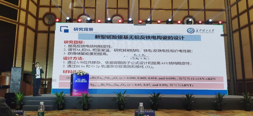 晏忠钠博士在“新型物理储能技术专场”做了题为《铌酸银基无铅反铁电陶瓷的相结构及介电储能性能研究》的学术报告,专题分享了铌酸银反铁电陶瓷在介电储能领域的应用前景及研究背景,并结合组分设计、相结构调控及介电储能行为表征,重点阐述了提升铌酸银无铅反铁电陶瓷储能密度的相关机理。