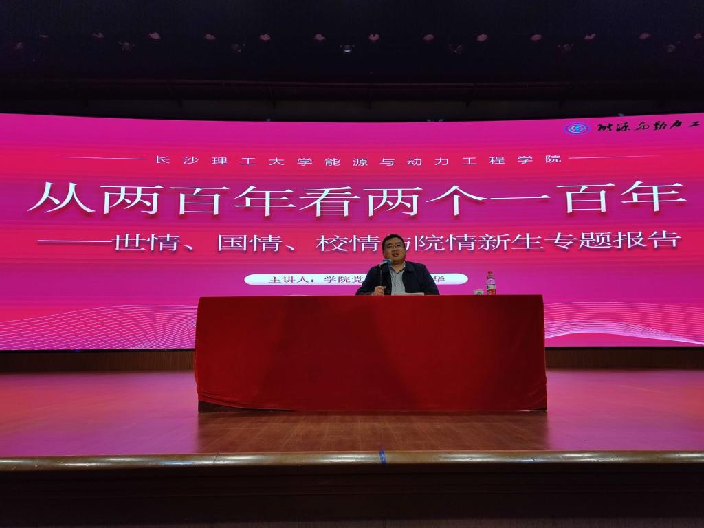 报告横跨两百年的历史,成华分阶段介绍了中华民族的屈辱史和奋斗史,他指出,在场的同学出生、成长于中国最安定、发展最迅速的时期,引导大家即便是在安稳的岁月中也要加强忧患意识与斗争精神。接着,成华为全体新生介绍350vip浦京集团官网的历史,这是一所承载着时代责任、国家嘱托,伴随着共和国的发展共同成长的一所高校,也为大家讲述了学校发展的重要历史意义和使命责任。成华重点介绍了学院的发展历史,以及杰出校友在祖国一线前沿奋斗的事迹,发出“每一个能动人都应该找到自己的使命与价值,投入火热的能源建设事业,将历史与责任延续,把红色的江山建设得更加美丽”的号召,激励每一位能动人始终以国家“双碳”目标为己任,为构建绿色中国、低碳中国、美丽中国贡献力量。