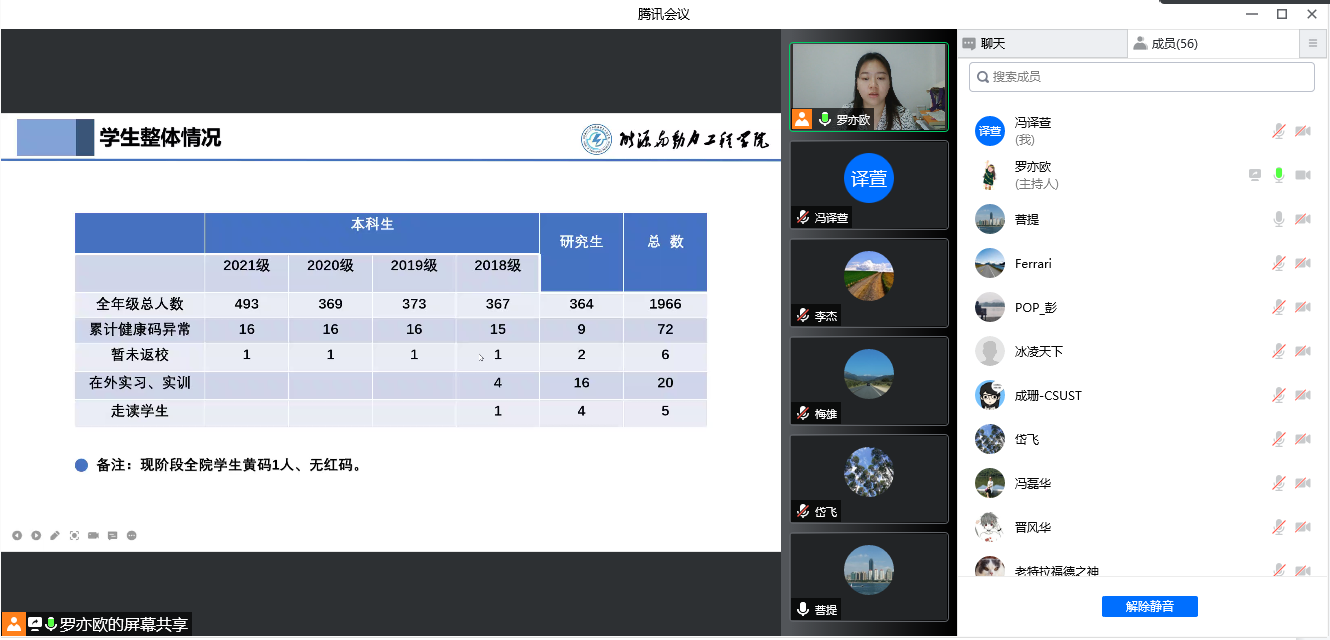 为进一步加强班主任、研究生队伍建设,充分发挥专业老师在专业学习引领与思想政治引导方面的作用,能动学院于4月10日晚7:30,组织开展日常管理、学风促进线上会议,学院党委副书记、副院长张晓烽,副院长孙小琴,全体学工办成员,全体本科生班主任、研究生导师参与本次会议,会议由罗亦欧主持。