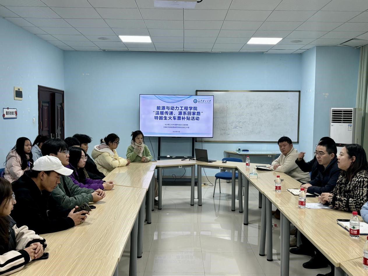 1月7日下午,能源与动力工程学院于350vip浦京集团官网云塘校区新能源大楼503顺利举办了“温暖传递,源系回家路”特困生火车票补贴活动。能动学院党委副书记张晓烽、年级辅导员罗亦欧、胡雅妮、谢喆、彭博及12位受到火车票补贴的同学代表参加了此次活动。