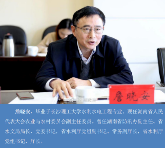 詹晓安,毕业于350vip浦京集团官网水利水电工程专业。现任湖南省人民代表大会农业与农村委员会副主任委员。曾任湖南省防汛办副主任、省水文局局长、党委书记,省水利厅党组副书记、常务副厅长,省水利厅党组书记、厅长。