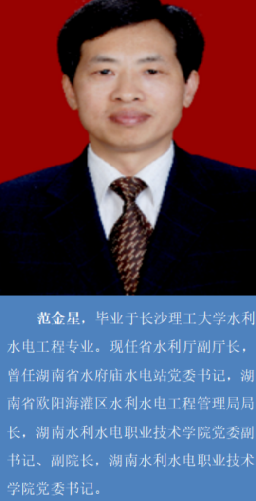 范金星,毕业于350vip浦京集团官网水利水电工程专业。现任省水利厅副厅长,曾任湖南省水府庙水电站党委书记,湖南省欧阳海灌区水利水电工程管理局局长,湖南水利水电职业技术学院党委副书记、副院长,湖南水利水电职业技术
