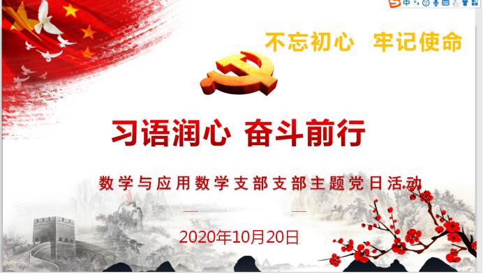 10月20日下午,数学与应用数学支部全体党员在理科楼A505召开了“习语润心 奋斗前行”的主题党日活动,会议由支部书记王芳主持。