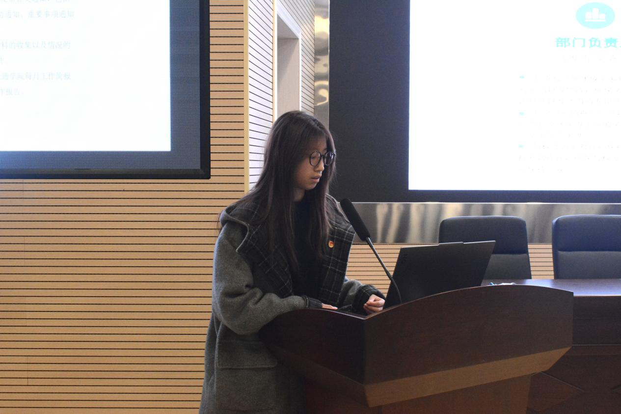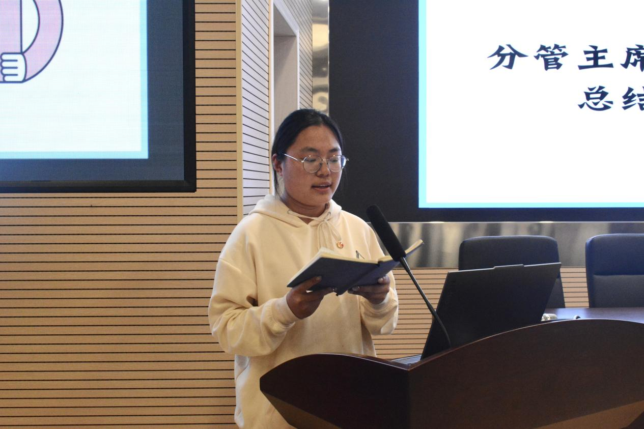 会议伊始,组织部、学习部、勤助部率先登台,细致入微的对上学期工作进行汇报。他们不仅条理清晰地阐述了过往工作的开展情况、取得的成绩,还以深刻自省的态度对工作中存在的问题进行了剖析与总结。随后,马欣宇对上述部门的表现进行了系统汇总,充分肯定了各部门的努力与成果,同时鼓励全体成员保持谦逊好学的态度,在未来的工作中继续脚踏实地、稳步前行。
