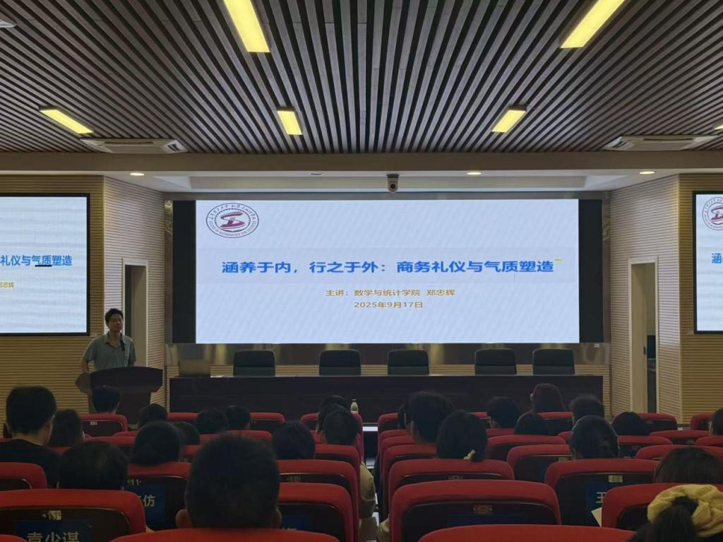 2025年9月17日下午,数学与统计学院在理科楼A200举办2025级研究生 “涵养于内,行之于外:商务礼仪与气质塑造” 专题学习活动。活动由院党委副书记兼副院长郑忠辉主讲,院研会干部及2025级全体研究生参与。