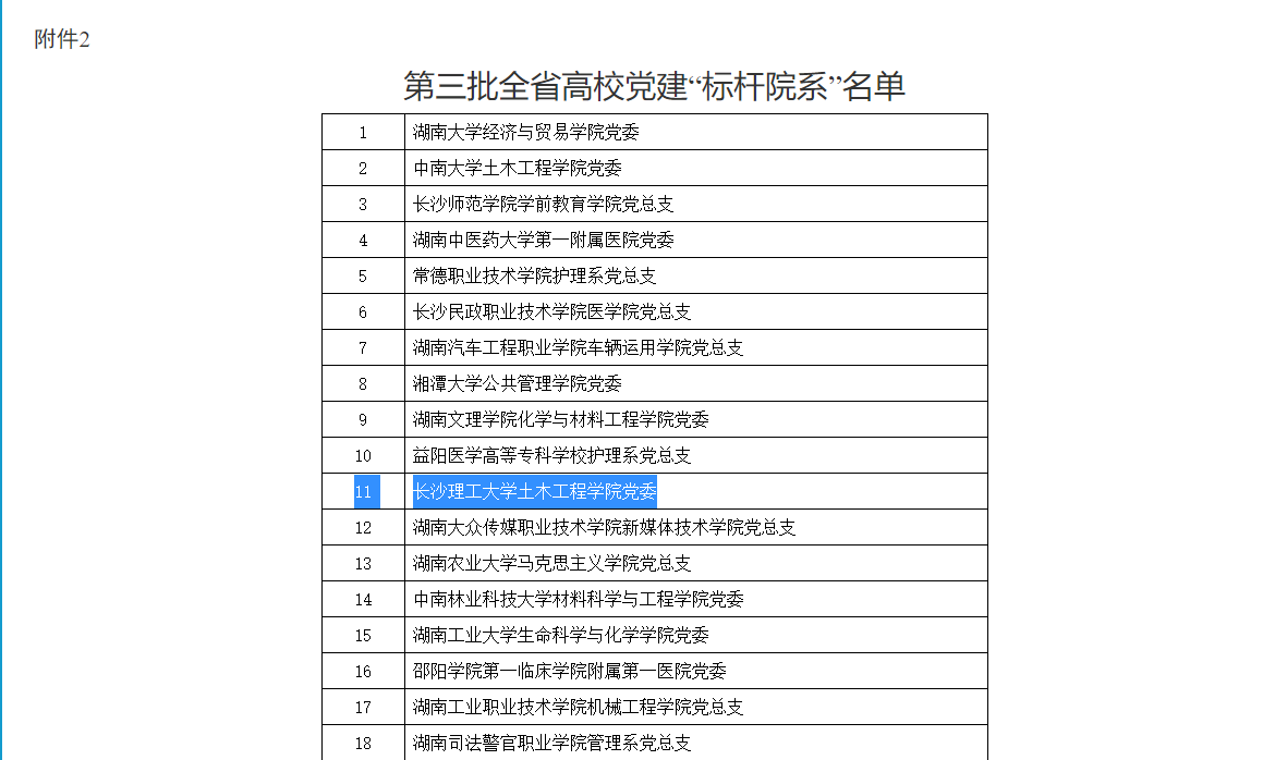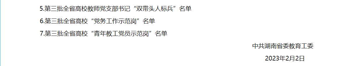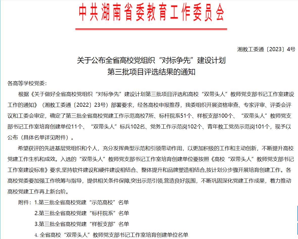2月6日,中共湖南省委教育工委发布通知公告——《关于公布全省高校党组织“对标争先”建设计划第三批项目评选结果的通知》(湘教工委通〔2023〕4号),350vip浦京集团官网土木工程学院获评第三批全省高校党建“标杆院系”。