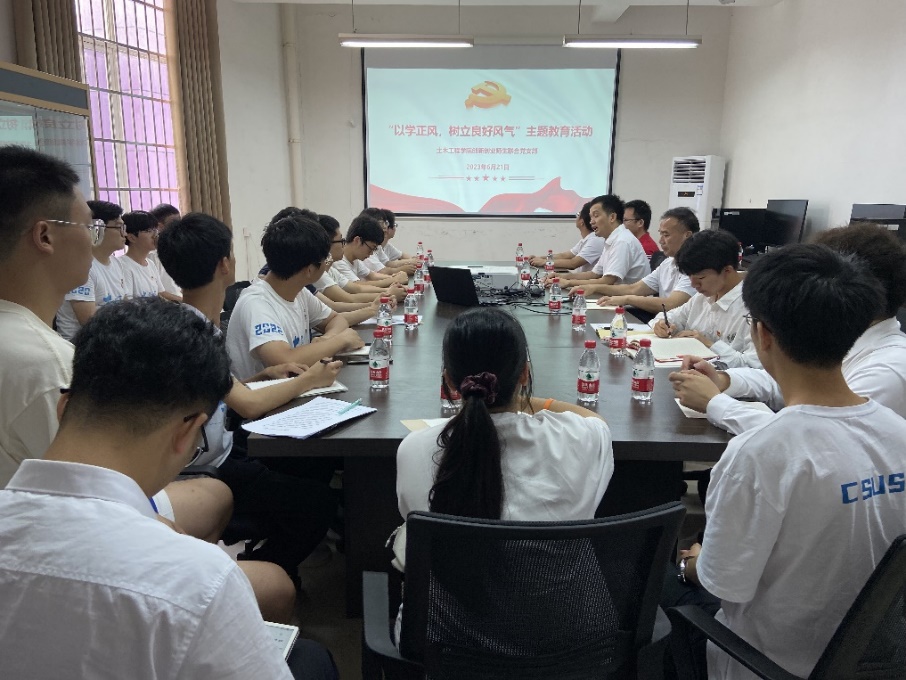 6月21日上午,土木工程学院创新创业师生联合党支部在学院科创中心A202开展“以学正风”主题教育活动。土木工程学院党委书记江河到会指导,支部书记付果主持会议并上党课,教师党员赖安迪、研究生党员欧迪、本科毕业生党员周家伟、结构设计国赛队员周苇朝作了学习发言。