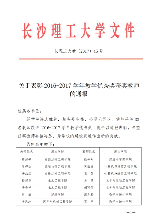 关于表彰2016-2017学年教学优秀奖获奖教师的通报