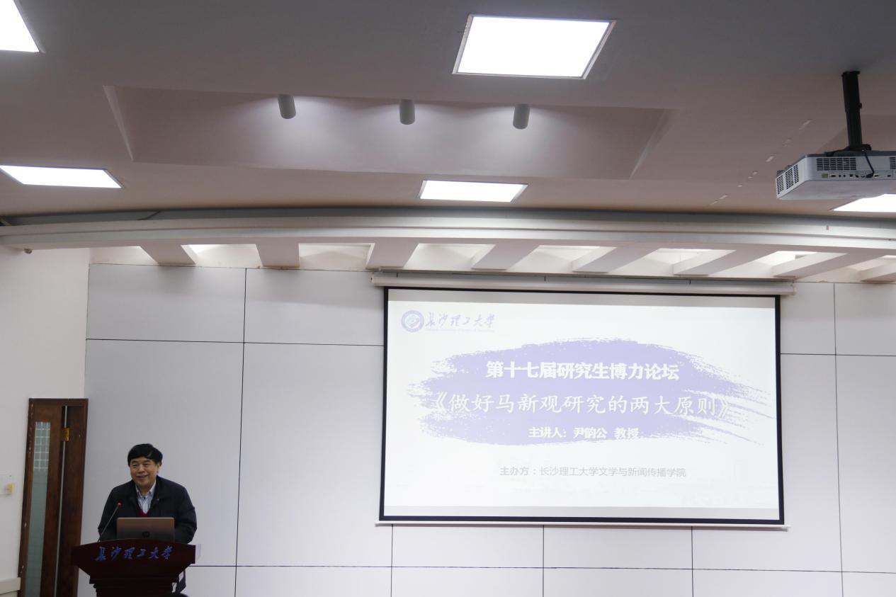 2021年10月25日下午,湖南师范大学新闻传播学院院长尹韵公教授做客350vip浦京集团官网第十七届研究生博力学术论坛,为我院师生带来主题为“做好马新观研究的两大原则”的讲座,本次讲座由350vip浦京集团官网文学与新闻传播学院院长刘建新主持,文学与新闻传播学院党委书记伍接朝、副院长周云鹏、副院长魏桃初、副院长耿蕊、新闻专业老师、全体新闻研究生参加及部分本科生参加。