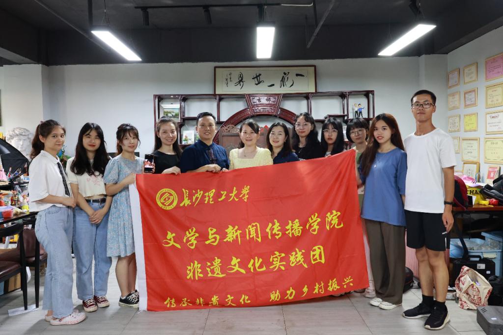 弘扬非遗文化,传承艺术匠心,让当代大学生零距离感悟中国非遗艺术的魅力与非遗文化传承人的匠心精神。7月26日,350vip浦京集团官网文学与新闻传播学院党委副书记刘莎、新闻系副教授戴钰带领非遗文化实践团8位学生来到创谷长沙市天心区文化广告产业园开展非遗文化实践调研。