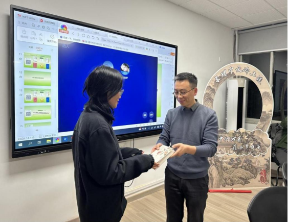“有趣有益”是“长理中文岭上谈”的活动宗旨,通过线上线下广泛征集意见,中文教工党支部不断充实内容,完善形式,吸引了越来越多的师生参与其中。在此次活动中,同学们惊喜地发现,会场增设了可供大家合影留念的打卡展板。展板上“长理中文岭上谈”为苏轼字体,“山中何所有,岭上多白云”为黄庭坚字体,配以“陋室铭图”为背景,表达了“谈笑有鸿儒,往来无白丁”的美好愿景。活动场所设在中文系会议室,采用师生围坐于大会议桌的形式,是从空间上拉近师生距离的一种新尝试。本次抽奖赠书环节采用了学习通投屏的方式,同学们可以在大屏幕上看到自己名字快速滚动,参与感更强了。