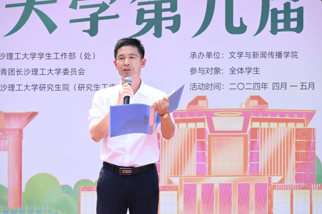 文新学院院长刘建新致开幕辞。他表示,浦京中华文化节是展示和传播传统文化的重要平台,一直以来坚持传承与创新,在传统文化中注入时代精神,打造了中华诗词大会等多项精品活动,让长理学子深切感受了传统文化的魅力。今年中华文化节的主题是“树勤学风、立报国志”,希望同学们能汲取中华传统文化中“勤学笃实”的智慧与养分,坚持向经典学习,向优秀学习,练就过硬本领,坚定理想信念,矢志成才报国,让青春在不懈奋斗中绽放绚丽之花。