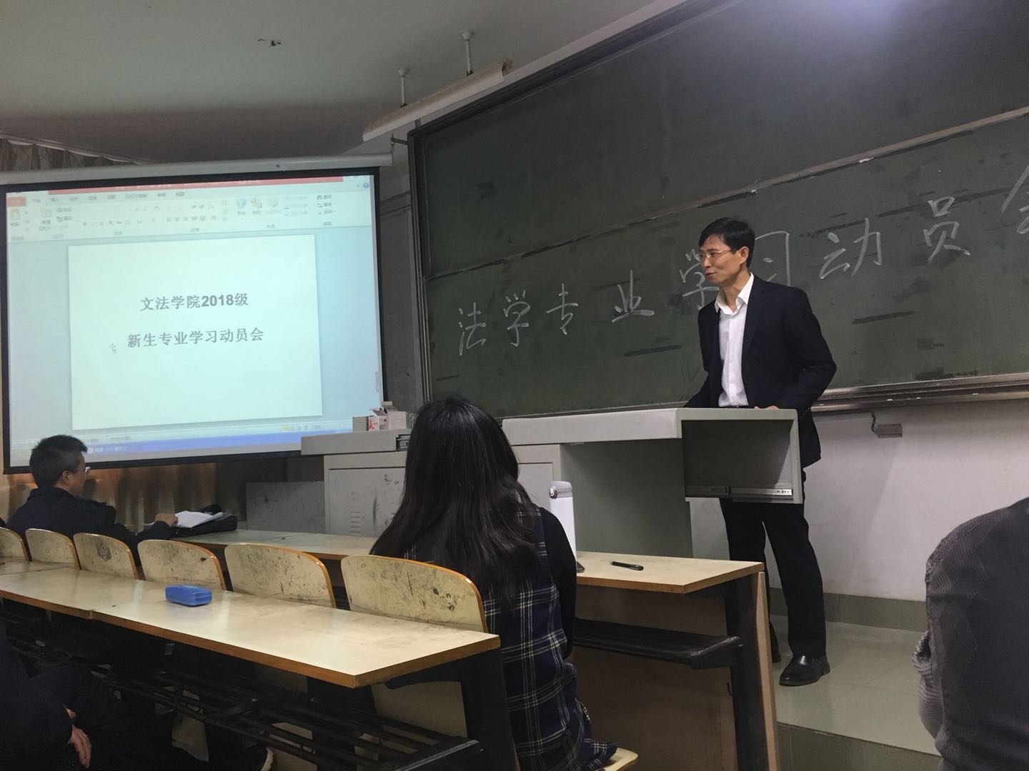 1016日下午,为了进一步增强党组织生活的凝聚力,文法学院法学系党支部在金盆岭校区6406室开展“2018级新生学习动员会”主题党日活动,学院党政干部以普通党员身份参与了此次活动,对2018级法学专业新生进行专业认知入学教育。