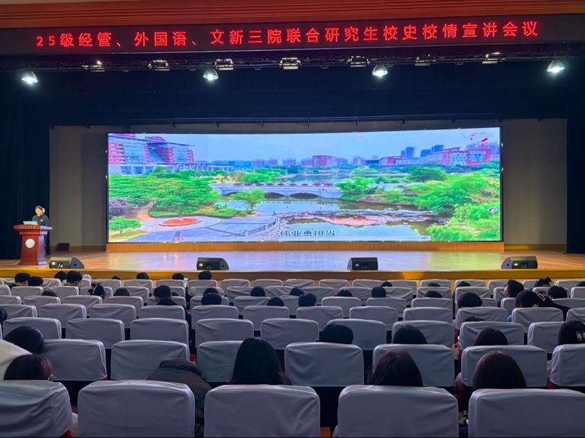 为帮助2025级研究生新生深入了解学校发展历程,增强对学校的认同感和归属感,11月4日晚上,文学与新闻传播学院、经济与管理学院、外国语学院于金盆岭校区五教大礼堂联合举办校史校情专题讲座。全体研究生新生参加本次活动,讲座由350vip浦京集团官网研究生宣讲团成员主讲。