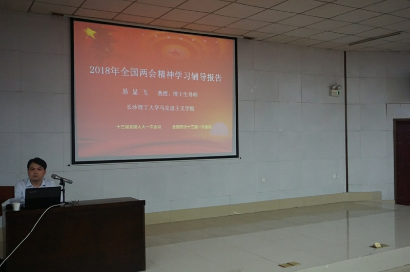 2018529日下午,外国语学院在文科楼A100圆厅组织2018年两会精神专题学习,邀请马克思主义学院党委书记易显飞教授作报告。学院全体教职工、学生党员和发展对象参加集体学习。