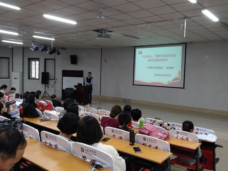 、10月22日下午,外国语学院院长段胜峰以“不忘初心、勇担外国语学院建设发展的使命”为题,在云塘校区文科楼A100学术报告厅给全院教职工、学生党员和入党积极分子上主题教育专题党课。