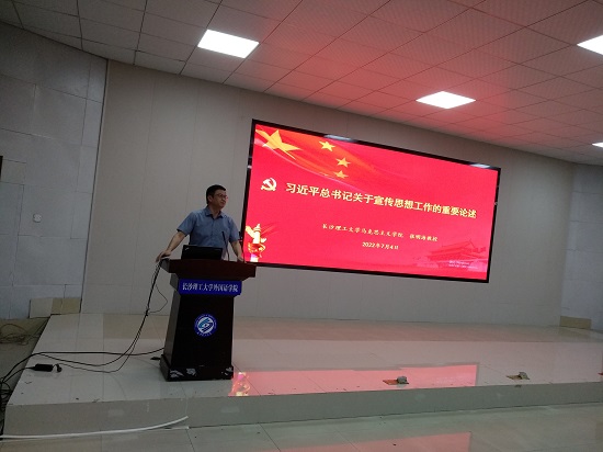 张明海教授以《习近平总书记关于宣传思想工作的重要论述》为题,他从习近平总书记关于宣传思想工作的重要论述的丰富内涵、新时代宣传工作面临的形势等两个大方面展开论述。