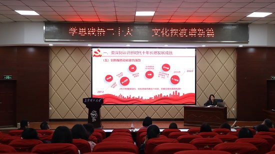 方琼紧密结合党的二十大报告原文,以中国现代化道路的探索为切入点,围绕学习贯彻党的二十大精神这条主线,从学习贯彻习近平总书记关于中国式现代化的重要论述、全面贯彻落实党的二十大精神、以中国式现代化引领学校内涵式高质量发展等三个方面展开论述。她表示习近平总书记在学习贯彻党的二十大精神研讨班开班式上发表重要讲话强调,“概括提出并深入阐述中国式现代化理论,是党的二十大一个重大理论创新,是科学社会主义的最新重大成果”。习近平总书记在人代会闭幕会上的重要讲话中强调“加快推进中国式现代化建设”,我们党的初心和使命,是为中国人民谋幸福、为中华民族谋复兴。中国共产党成立一百多年来所进行的一切奋斗,目的就是把我国建设成为社会主义现代化强国、实现中华民族伟大复兴。