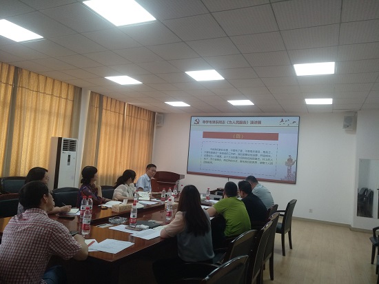 院长段胜峰领学《为人民服务》经典篇目及历届领导人谈政绩观。他首先领学毛泽东同志于1944年9月8日在延安枣园操场为张思德同志召开追悼会以《为人民服务》为题的演讲稿。他指出,毛泽东同志提出为人民服务是立党的完旨,突出强调了中国共产党宗旨的纯粹与极致。他指出,高校党员干部要有担当精神,对党要绝对忠诚。平常要多思考干事创业是否有利于广大师生,是否有利于提升学校核心竞争力。最后他从历届领导人谈政绩观一一进行了认真阐述。他归纳总结,中国共产党政治领导人的政绩思想是正确政绩观的基础,具有科学性、辩证性、合规律性、人民利益至上性等特征。
