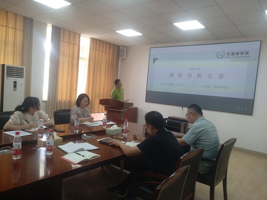 黄坚副院长汇报赴省外高校调研情况,他与武俊辉副院长、辅导员毛婕一行3人于6月中旬到西南交通大学、重庆交通大学两所高校进行调研走访。调研两所高校在学科专业建设、公共外语课程设置、人才培养、激励措施等几方面内容。通过调研,深入了解两所高校的整体状况,分析并总结它们的优势和短板。在此基础上,精准定位学院的发展方向和着力点。