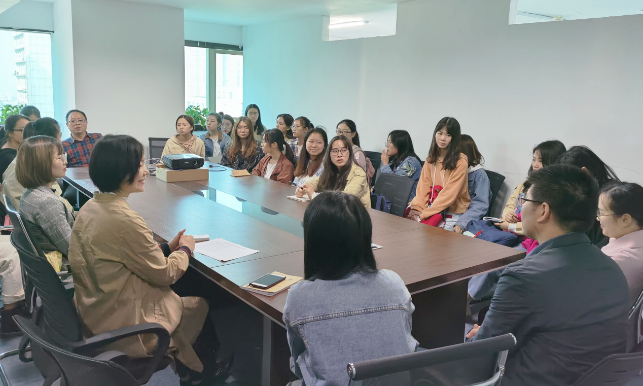 在实训开始之前,外国语学院邓跃平教授与雅瑞思翻译公司总经理叶桂喜、副总经理侯彩云、翻译中心总监李巳荣以及翻译实习相关指导老师进行座谈,就实训工作进行沟通对接。实习生们也参与了此次座谈,认真聆听接下来的实习工作安排和需要注意的事项,并表示对即将进行的翻译实习充满期待。
