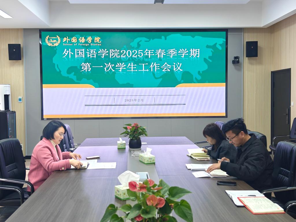 2月24日上午10:00,外国语学院2025年春季学期第一次学生工作会议在金盆岭校区三教214会议室召开。会议由学院党委副书记周芳主持,全体辅导员参加会议。