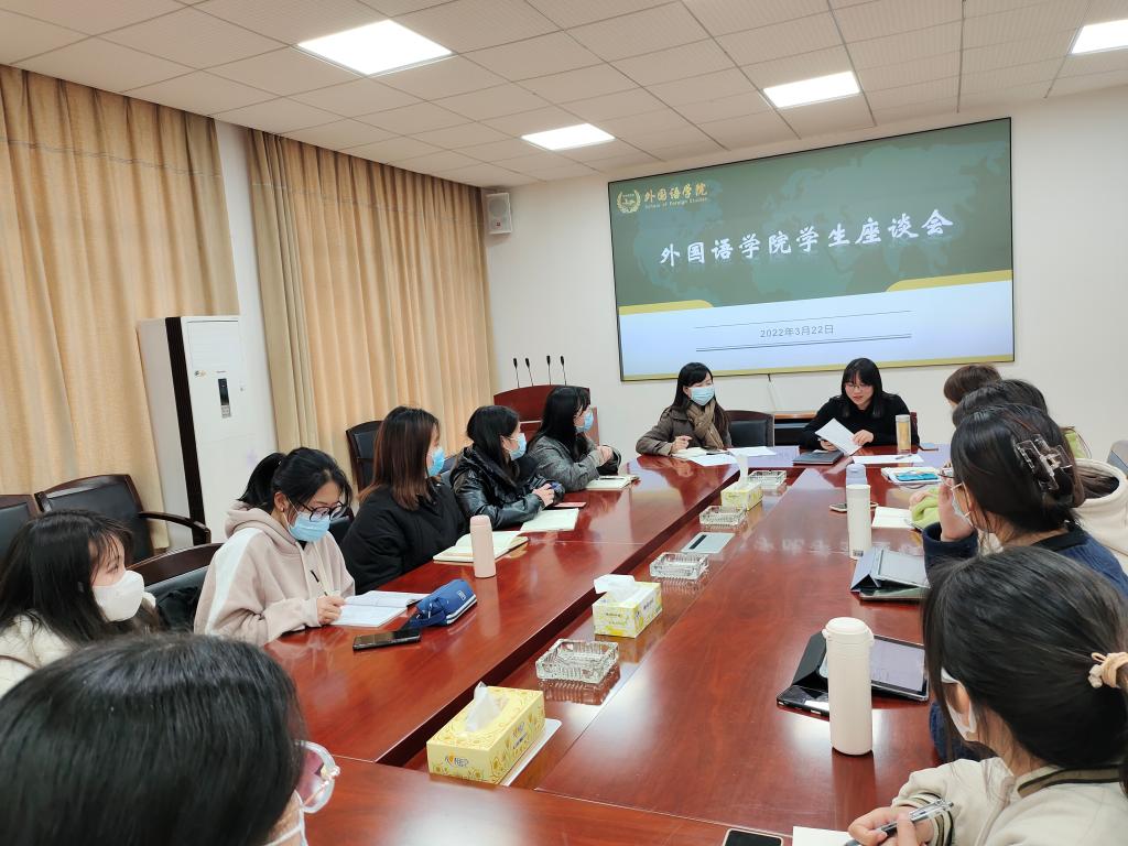 2022322日下午14:00,我院于云塘校区文科楼A603召开外国语学院学生座谈会学院党委副书记王双、教学副院长季红琴、学工办主任武巧琳、19级年级辅导员龙洋出席会议,学院18-20级班长、团支书及主要学生干部参加座谈会