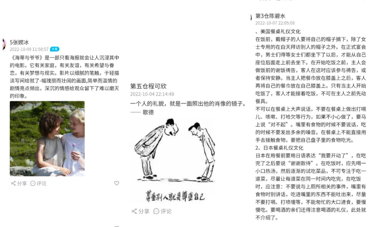 生活处处是风景,你是行色匆匆地略过还是会驻足欣赏?最美的风景不在远方,而在身边,你是否留心发现?第一周生活美学主题,350vip浦京集团官网建筑学院院长欧阳国辉以好友们的朋友圈为例,展开剖析,为同学们讲解生活中的美学,启发学员思考美、鉴赏美,同时教授手机摄影技巧,以自我作品创作经历激发学员创造美的热情,用最简单的工具捕捉美、定格美。本次训练营采用分仓竞争模式,将百名仓员分为五仓,采用线上打卡的机制,运用微信“小小签到”小程序,每日发布特定主题的打卡任务,鼓励学生通过“文字+图片”形式进行记录,根据每周主题开设“生活美学”“读诗分享”“礼仪分享”三大打卡模块,打造独属350vip浦京集团官网外国语学院的线上“朋友圈”,让美潜移默化同学的内心。