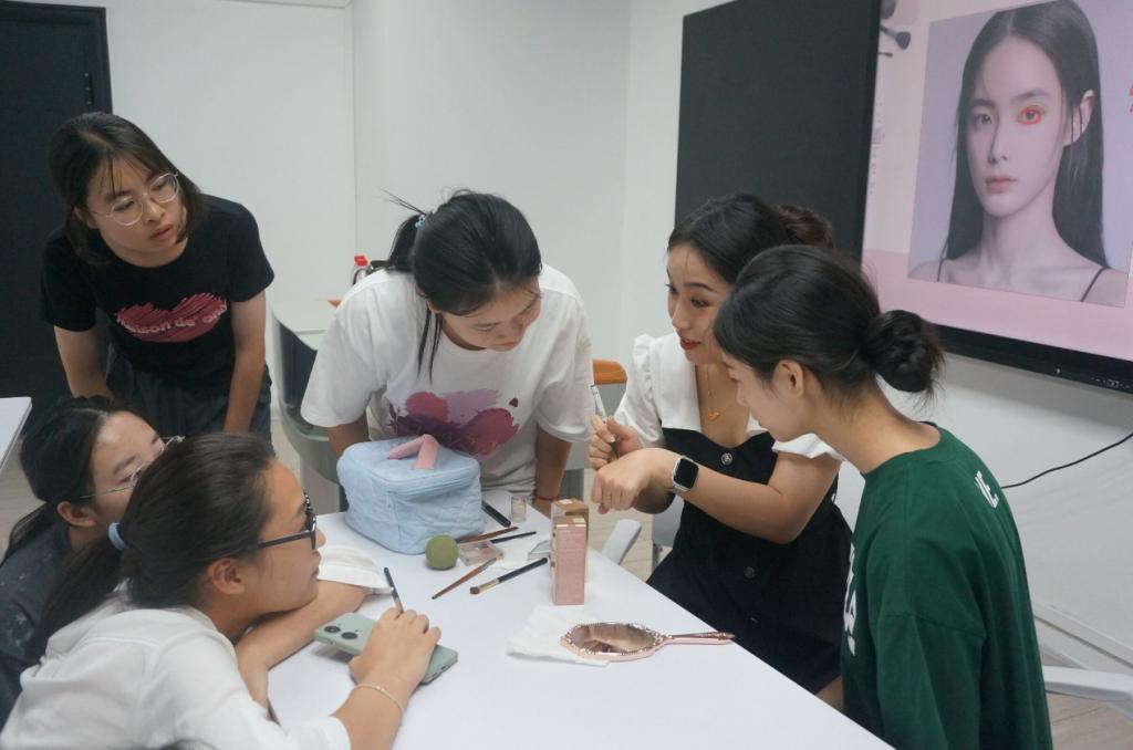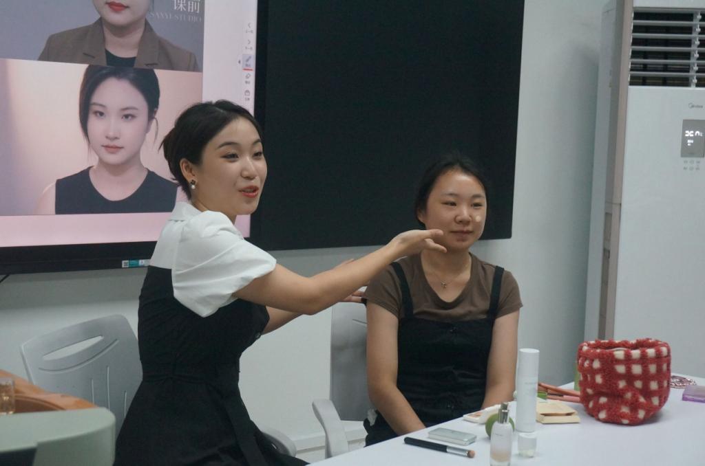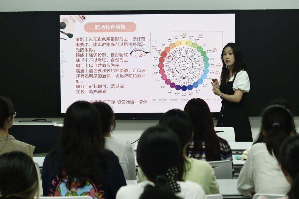 樊明焱老师从理论知识分享与现场实践演练两个方面展开培训,先以“三庭五眼”等相关美妆基础知识讲解来带领大家认识自身化妆条件,鼓励同学们通过多尝试去寻找属于自己的化妆风格,多练习以掌握扬长避短的化妆技巧,达到令人眼前一亮的职场妆容。她提醒道:“职场妆容是符合工作环境与特点,表现理智与成熟的化妆妆容”,并借色相环中不同色调,向同学们介绍妆色、妆感差异给人带来的不同影响,分析了无效化妆的原因所在。同时,我院学生积极实践,根据樊明焱老师的亲自示范,以及逐个的面部特点分析与妆容妆面定制,充分认知自我,在探索出属于自己的职场妆容风格之余,更提升了气质增强了自信。活动反响热烈,与会学生收获良多。