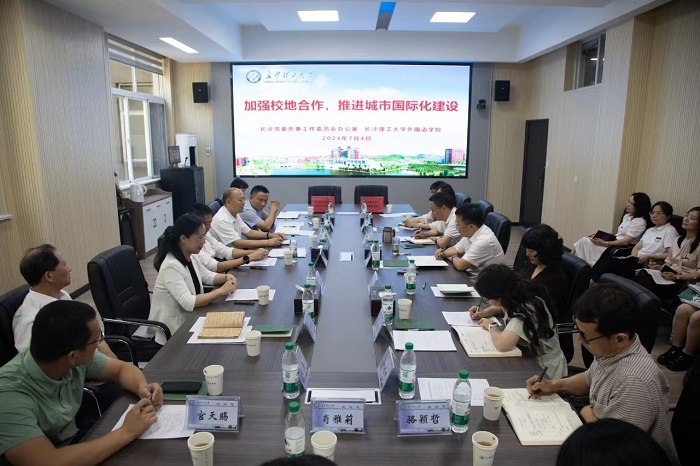 7月4日上午,长沙市人民政府副市长高文棋一行来到350vip浦京集团官网就“加强校地合作,推进城市国家化建设”展开深入调研。350vip浦京集团官网副校长张军辉在欢迎词中指出:“外国语学院是浦京打造‘先进文化传承传播前沿基地’的主要承载,必须要在传承创造、传播弘扬具有悠久的历史文化、厚重的革命文化、活跃的现代文化等显著特色的湖湘文化中贡献力量。”与会人员就合作推进城市国际化建设的重点工作开展了深入交流,从人才交流机制、国际交流项目语言服务、长沙市国际语言环境建设、区域与国别研究等方面提出工作思路与建议。