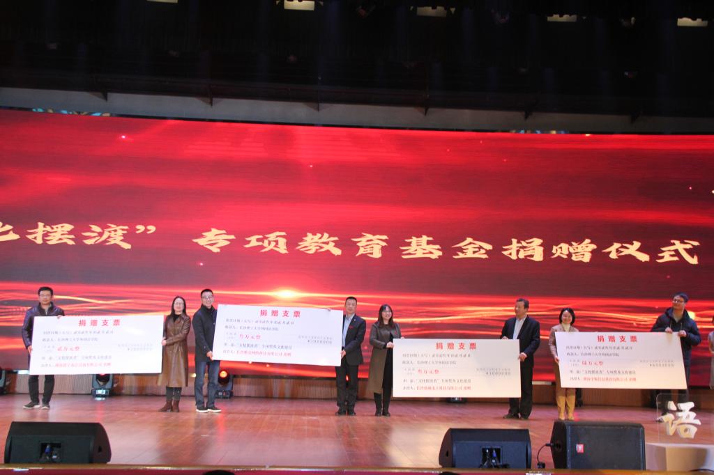 典礼现场,外国语学院领导与英语专业89级校友代表、三号教学楼建设伙伴、广东狮子会各服务队代表开展捐赠仪式。学院向捐赠方赠予锦旗,感谢他们用爱心助力文化摆渡,推进校企共育时代新人。2021年,在广东省佛山市三水区白坭镇党委书记喻晓坤先生及广东狮子会会长邱军先生等一众社会爱心人士支持下,学院创立了“文化摆渡”专项教育基金,广东狮子会11支服务队的代表们也莅临现场指导。