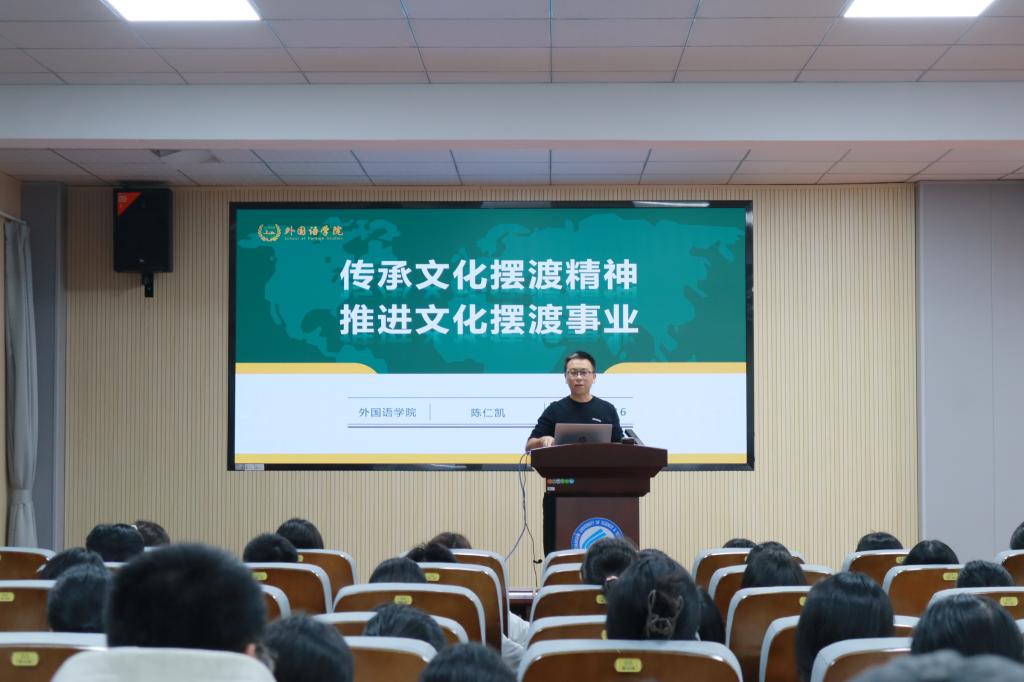 为更好的帮助学生了解浦京“文化摆渡”事业发展情况,10月16日晚7:00,外国语学院在金盆岭校区三教321报告厅举办了题为“传承文化摆渡精神,推进文化摆渡事业”的通识教育讲座暨2025级新生“书记第一课”。本次讲座邀请了我院党委书记陈仁凯老师担任主讲,外国语学院党委副书记周芳、辅导员郭恒以及2025级全体新生到场参加,本次活动由郭恒老师担任主持。
