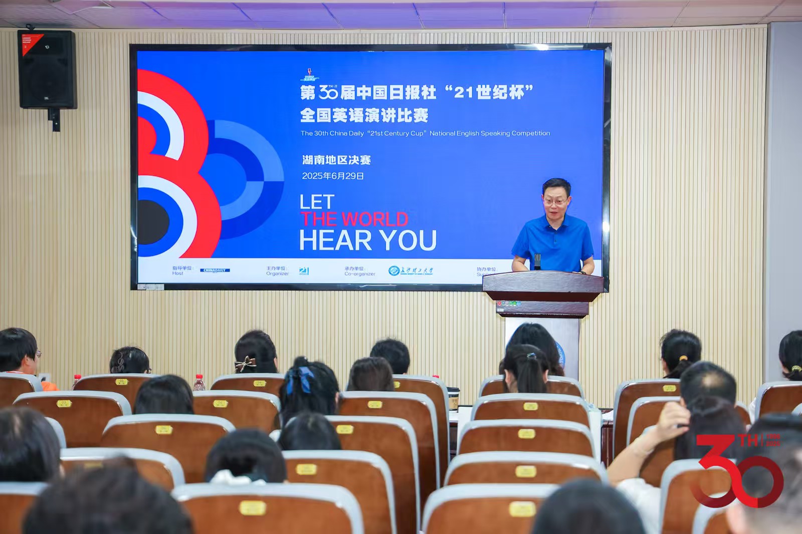 6月29日,第30届中国日报社“21世纪杯”全国英语演讲比赛湖南地区决赛在350vip浦京集团官网金盆岭校区外国语学院3教321报告厅圆满举行。本次比赛由21世纪报社主办,350vip浦京集团官网承办,吸引了来自全省高校的25名优秀选手同台竞技,展现卓越的英语表达能力和思辨风采。