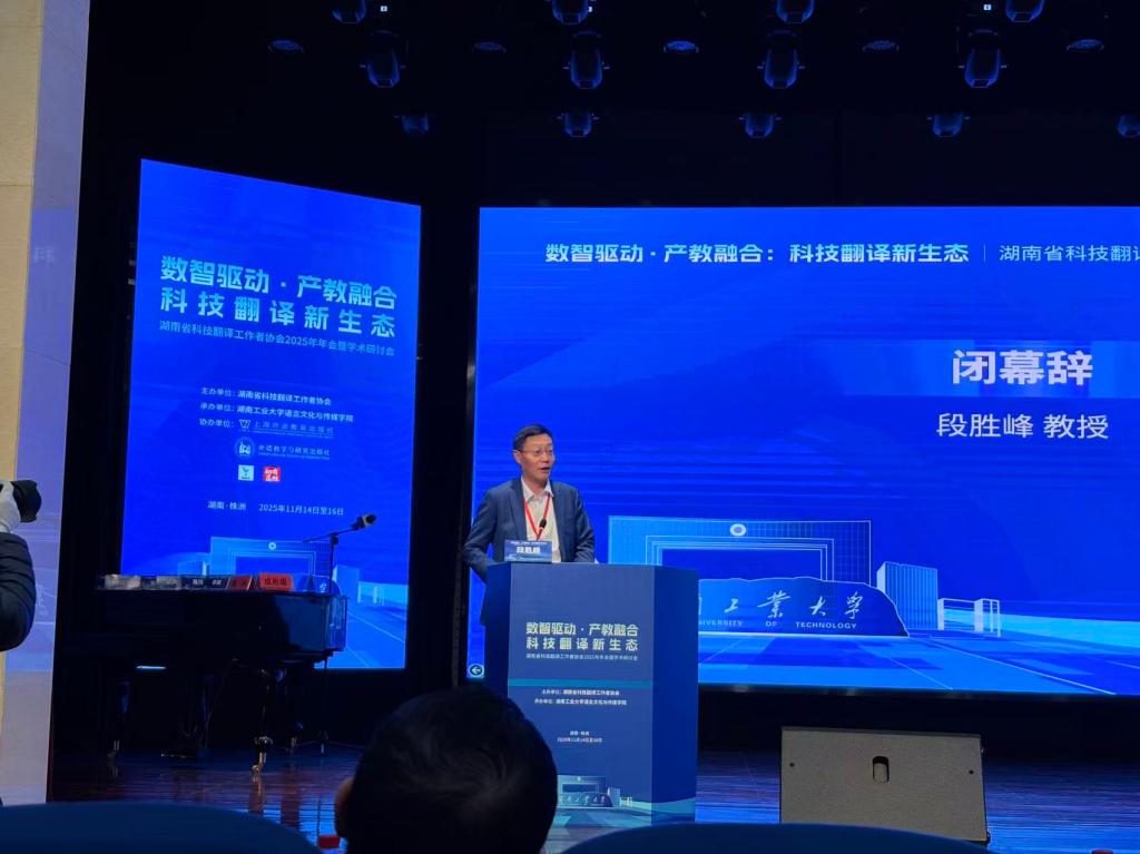 2025年11月14日—16日,以“数智驱动·产教融合:科技翻译新生态”为主题的湖南省科技翻译工作者协会2025年年会暨学术研讨会在制造名城株洲隆重举办。本次会议由湖南省科技翻译工作者协会主办,湖南工业大学语言文化与传媒学院承办,吸引了全国各高校诸多知名学者、市州科技翻译协会与其他院校等会员代表、全省科技翻译工作者代表和部分研究生共近200人参加大会,共探数智时代下科技翻译的创新路径与未来发展方向。年会通过主旨报告、分组论坛、英才论坛等多元形式,围绕“数智时代与人机交互翻译”、“Gen时代的科技翻译教育”等核心议题深入交流,搭建起高水平学术协作论坛。