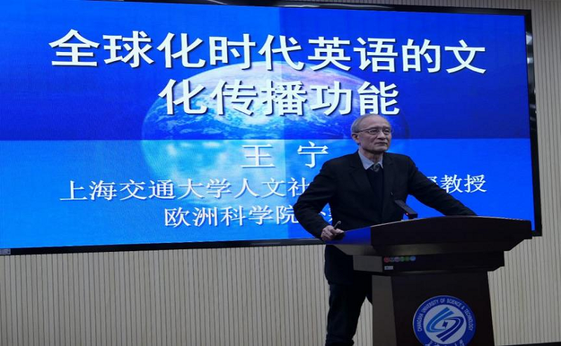 2024年2月29日晚,上海交通大学人文社会科学资深教授、清华大学特聘教授王宁应邀来到350vip浦京集团官网金盆岭校区,为学院师生们献上了一场精彩的学术讲座。此次讲座以“全球化时代英语的文化传播功能”为主题,在第三教学楼321报告厅举行,吸引了学院150多名学生和40位教师到场聆听。讲座由学院院长段胜峰主持,350vip浦京集团官网社科处处长刘建江致欢迎辞。