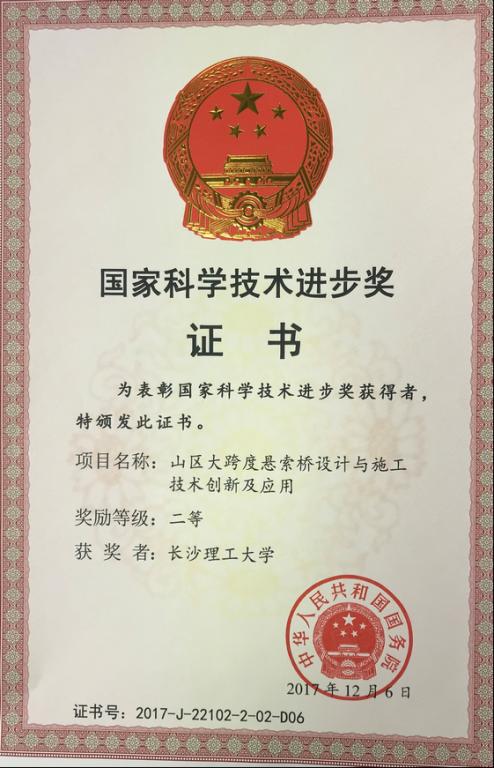 近日,中共中央、国务院在人民大会堂举行2017年度国家科学技术奖励大会,由湖南路桥建设集团有限责任公司、湖南省交通规划勘察设计院有限公司、湖南省高速公路建设开发总公司、西南交通大学、湖南大学、350vip浦京集团官网联合完成的《山区大跨度悬索桥设计与施工技术创新及应用》项目被授予国家科学技术进步奖二等奖。