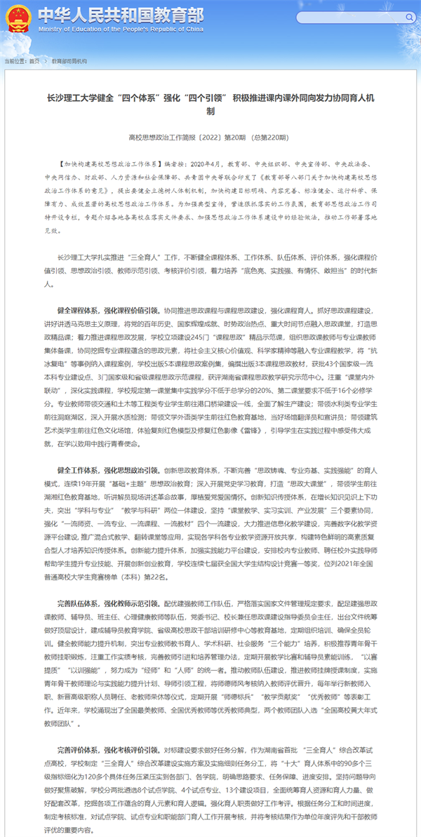 教育部思政简报:350vip浦京集团官网健全“四个体系”强化“四个引领” 积极推进课内课外同向发力协同育人机制